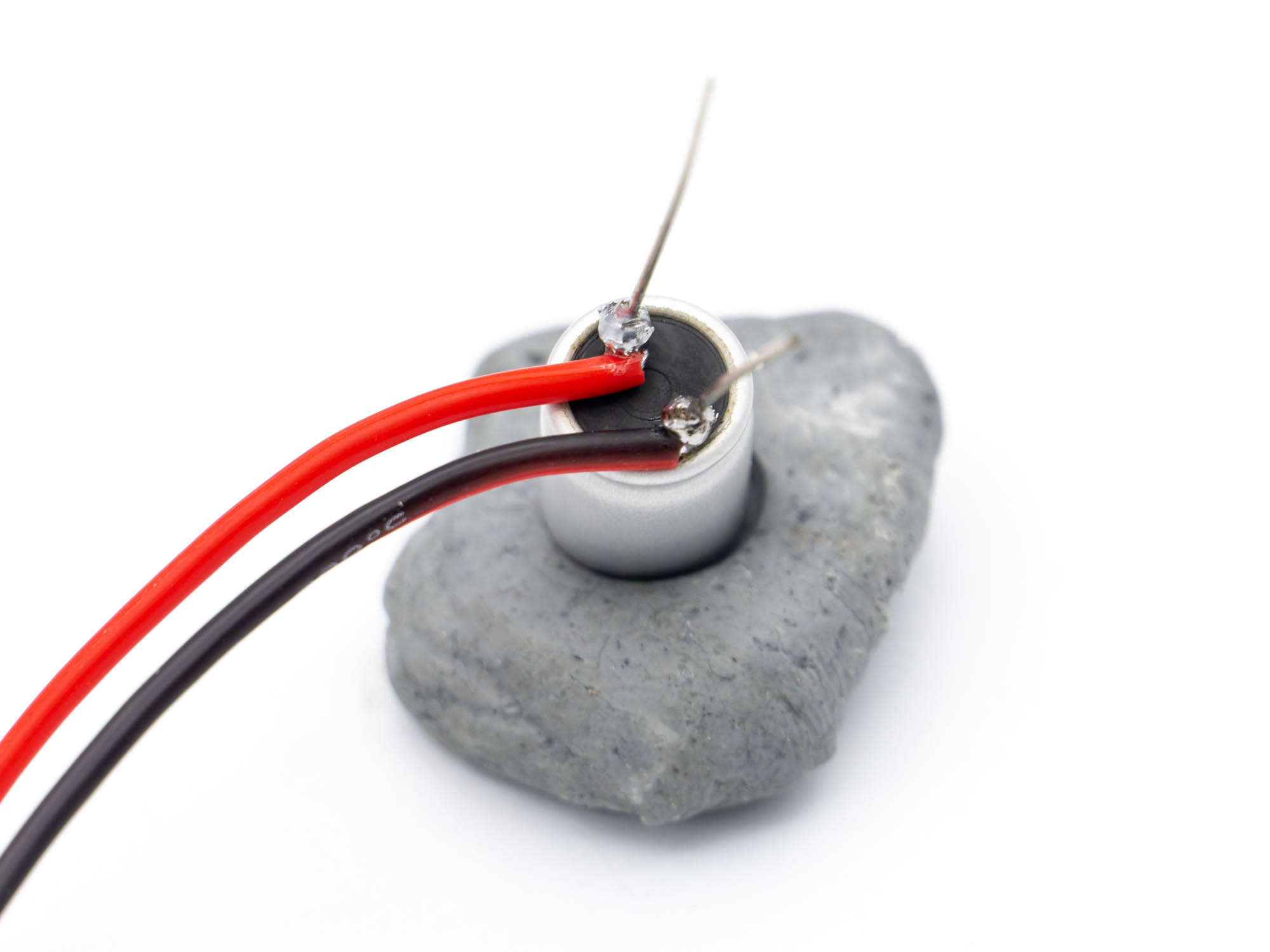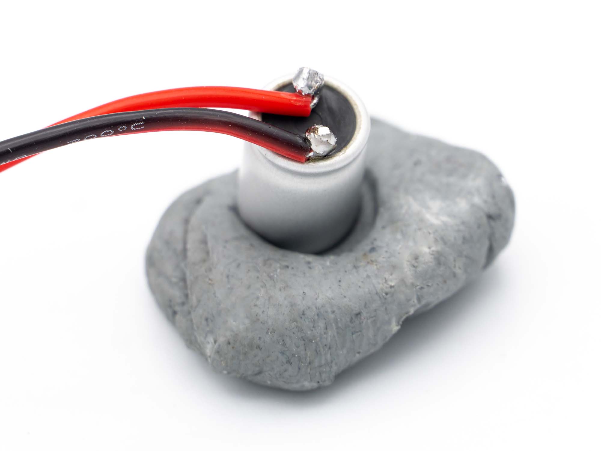 Prepare the capacitor by stripping a bit of insulation off the wires, wrapping them around the cap legs tightly and then soldering them. Black=Ground/Minus → Short leg Red=Plus → Long leg Then cut off the excess legs
