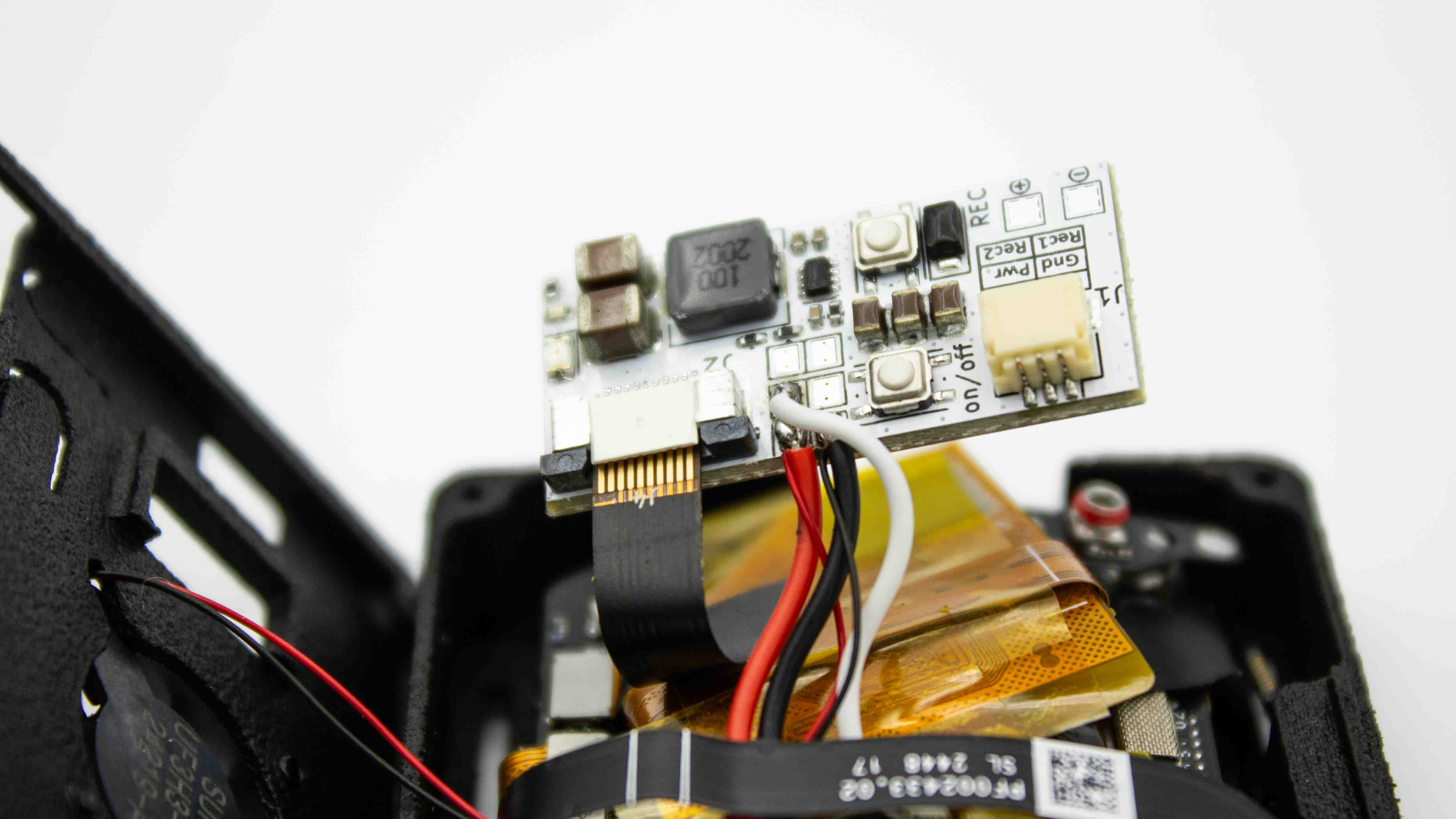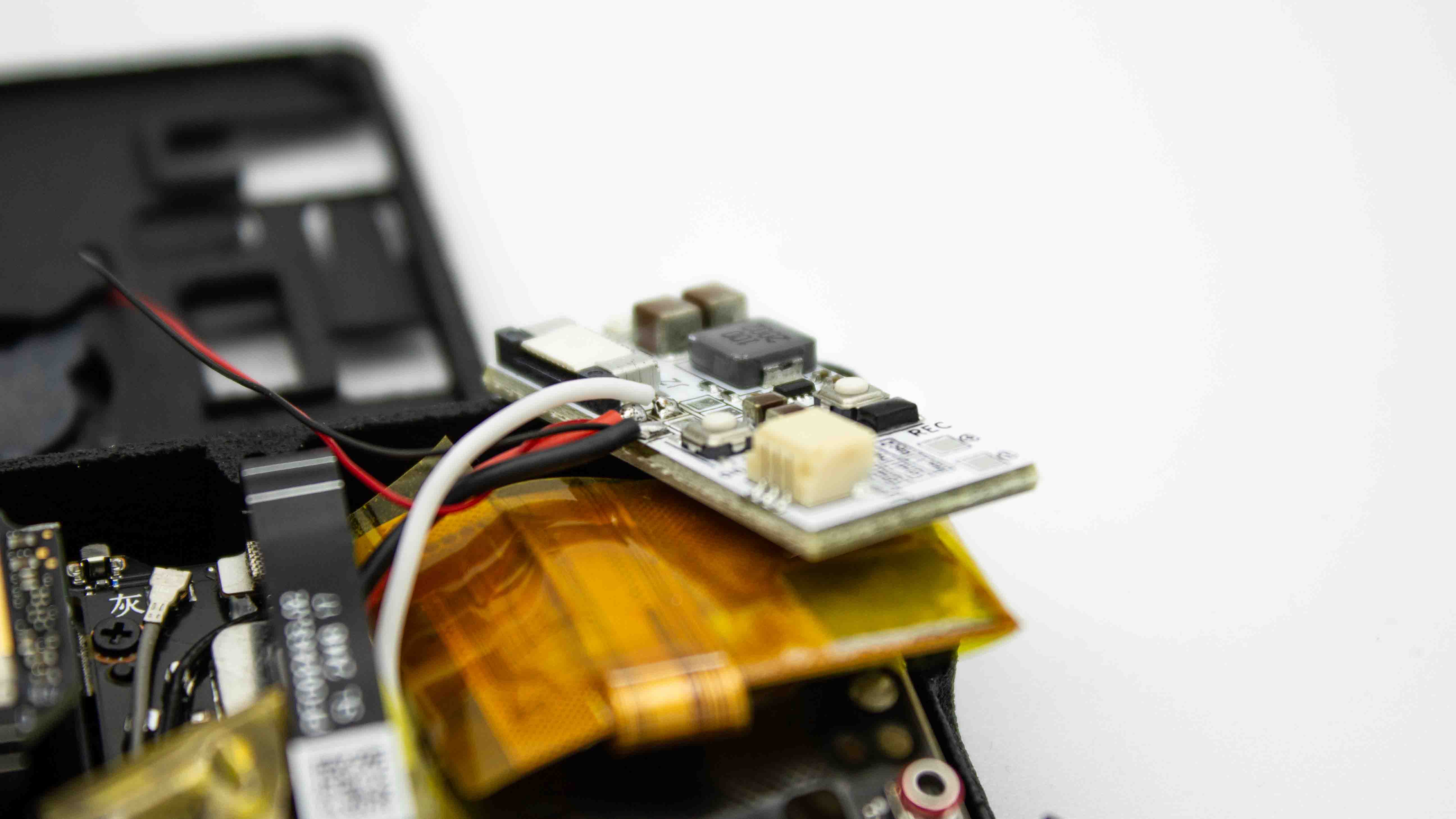 - Solder a black wire to the - solder pad of the mainboard and a red wire to the + solder pad of the mainboard.