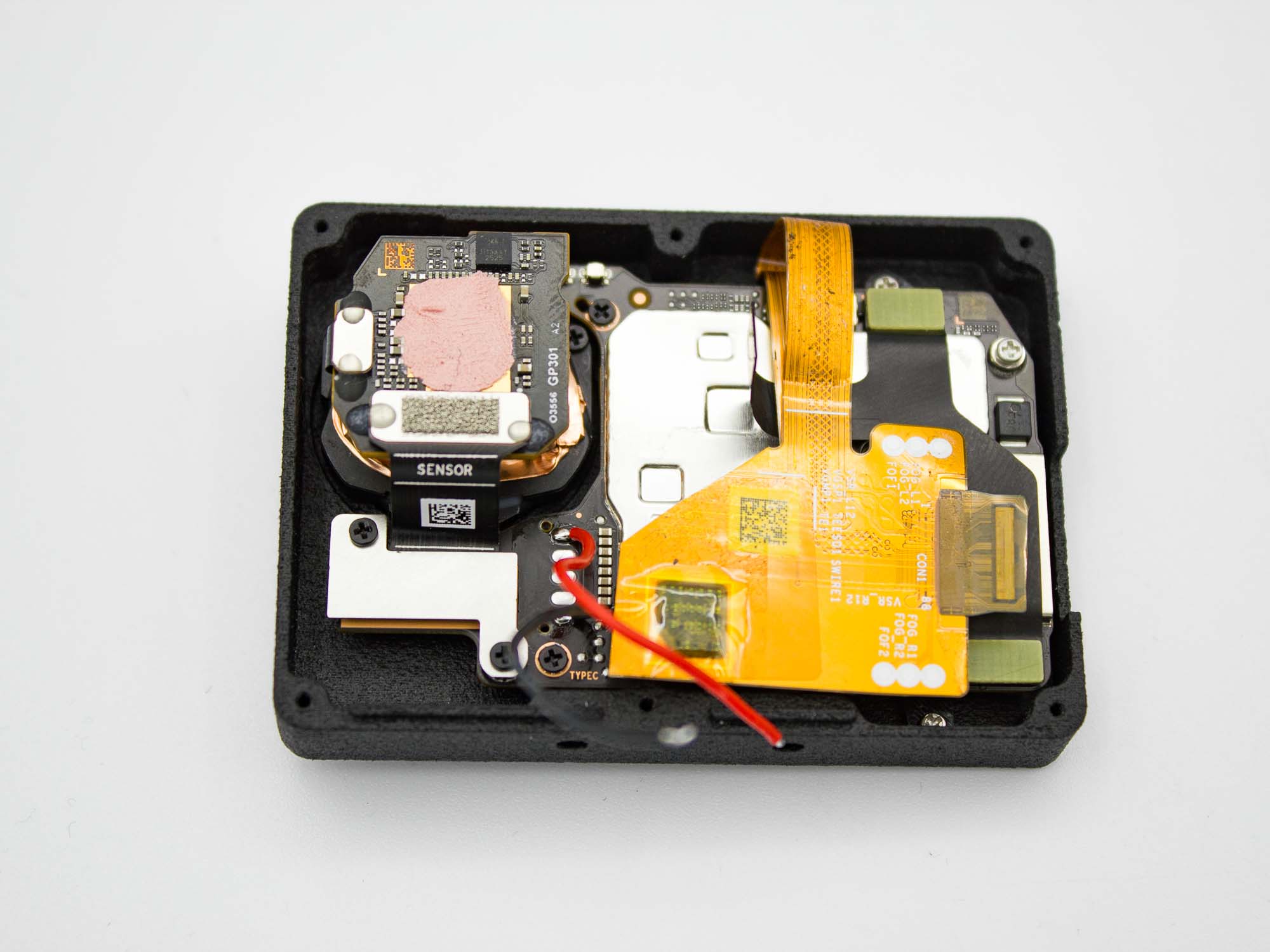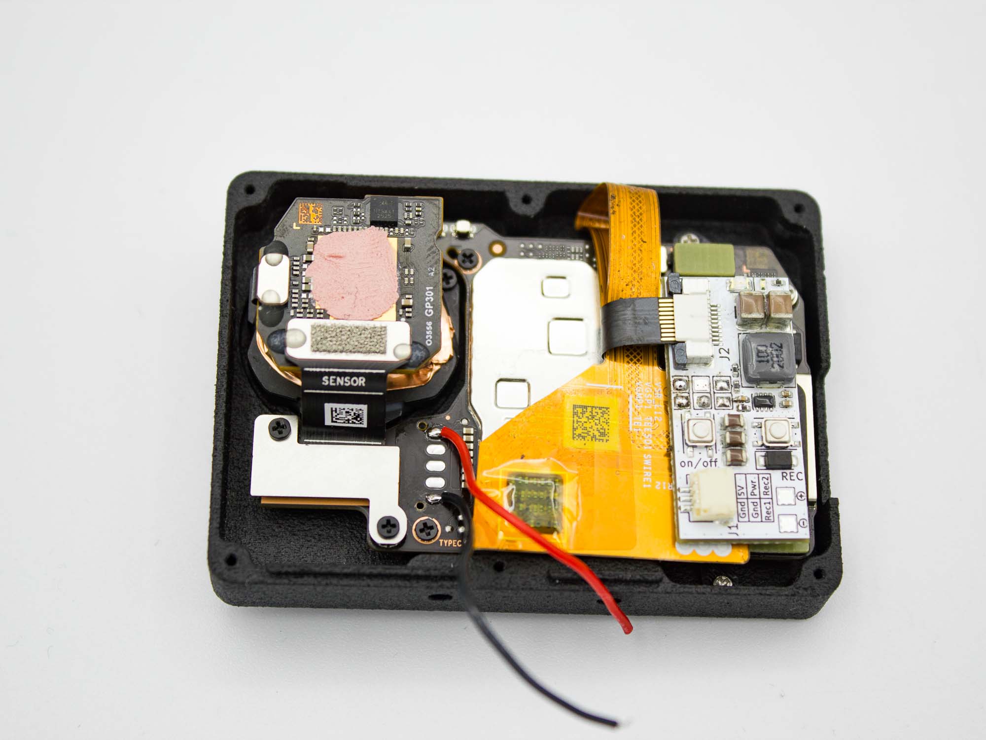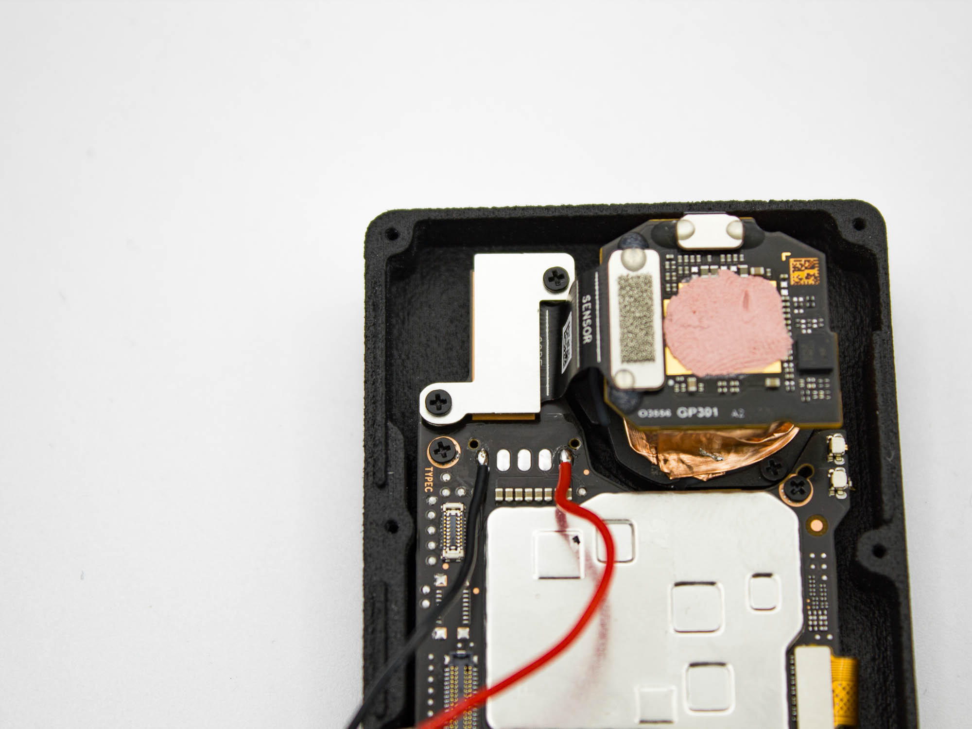 In its naked configuration, the DJI Action 6 camera may exhibit stabilization artifacts after processing footage with Gyroflow. These issues are caused by slight movement of the sensor PCB and its onboard gyro. To resolve this, place a piece of foam between the rear cover and the sensor PCB. The foam must apply firm pressure to securely fix the sensor assembly. Correct pressure is achieved when the rear cover needs to be pressed onto the camera by hand before inserting the screws.