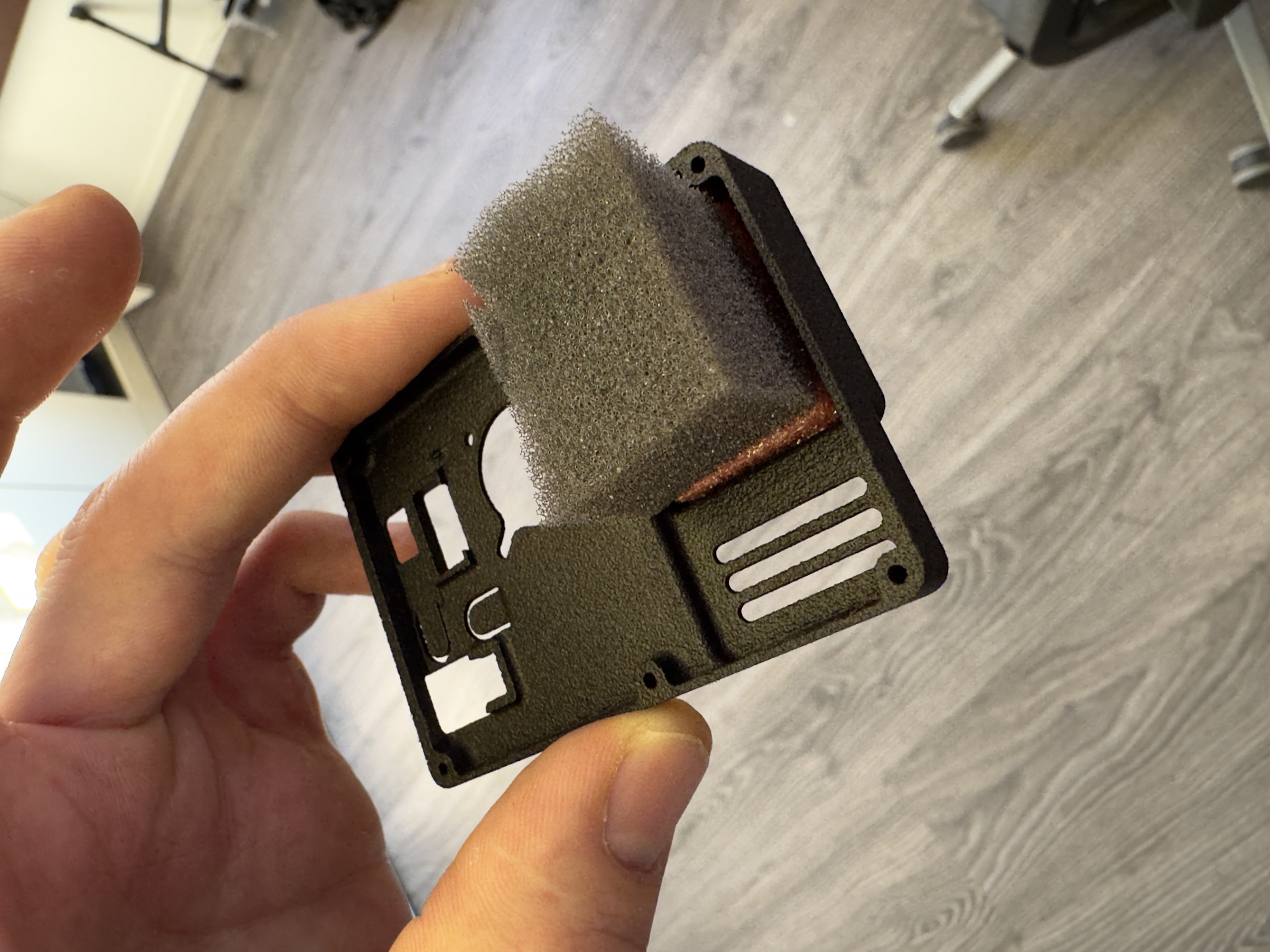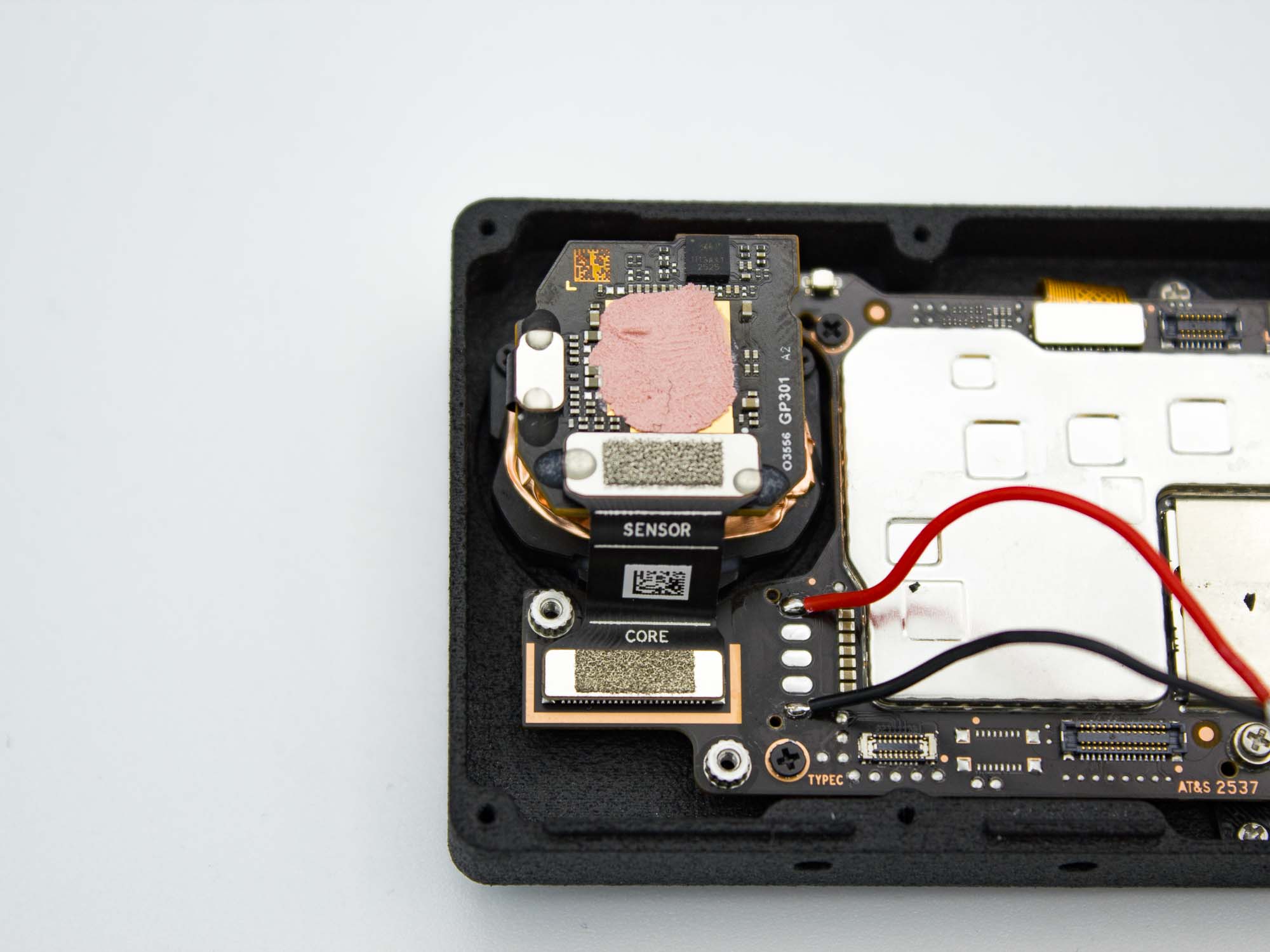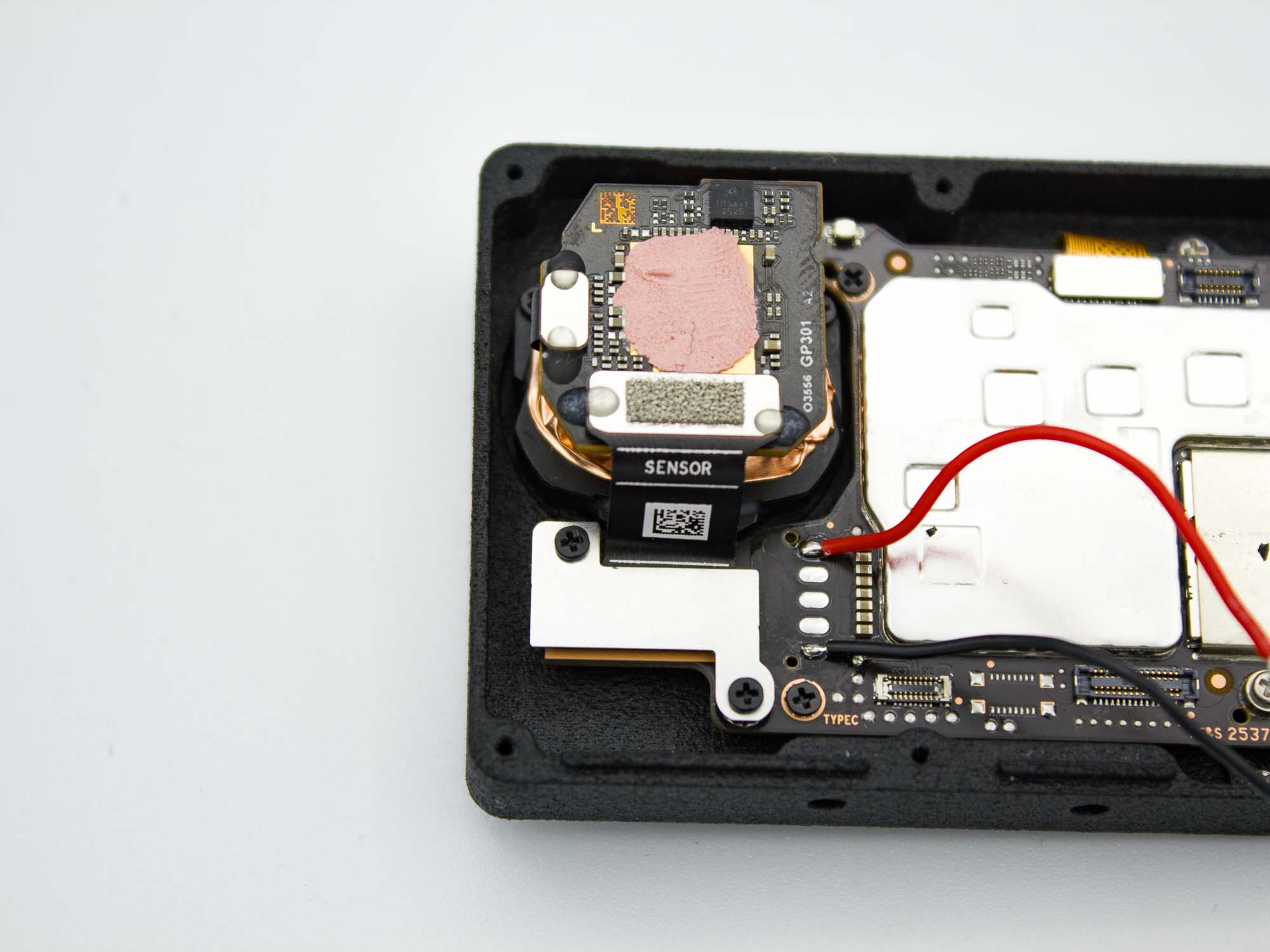 In its naked configuration, the DJI Action 6 camera may exhibit stabilization artifacts after processing footage with Gyroflow. These issues are caused by slight movement of the sensor PCB and its onboard gyro. To resolve this, place a piece of foam between the rear cover and the sensor PCB. The foam must apply firm pressure to securely fix the sensor assembly. Correct pressure is achieved when the rear cover needs to be pressed onto the camera by hand before inserting the screws.