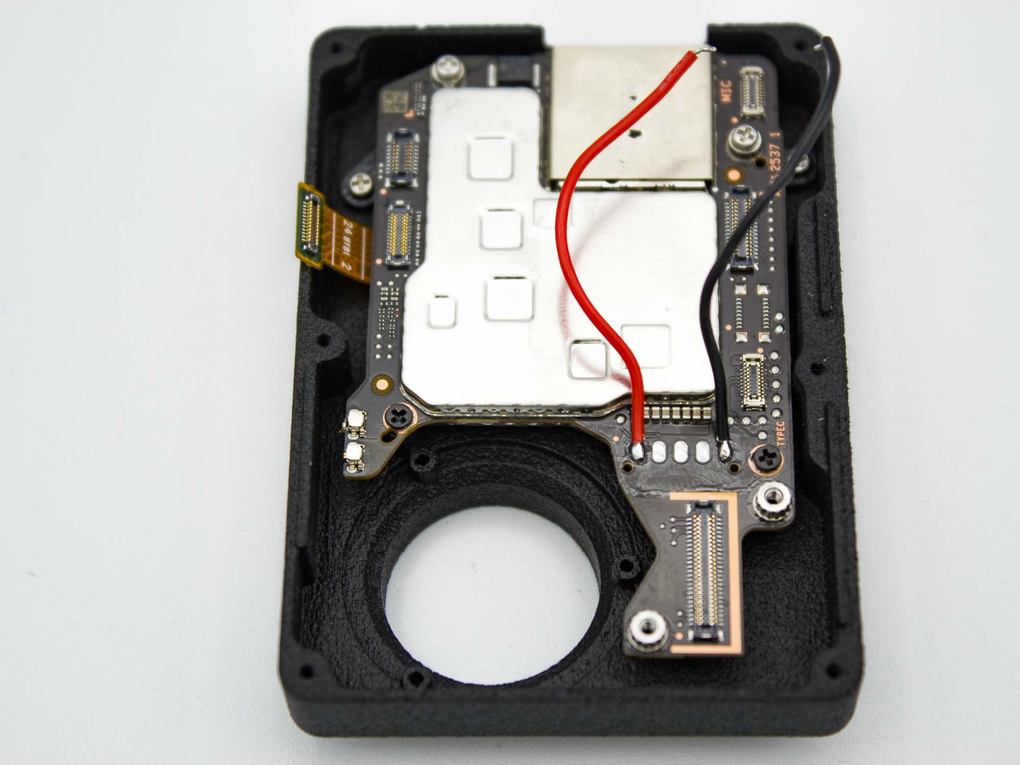 - Solder a black wire to the - solder pad of the mainboard and a red wire to the + solder pad of the mainboard.