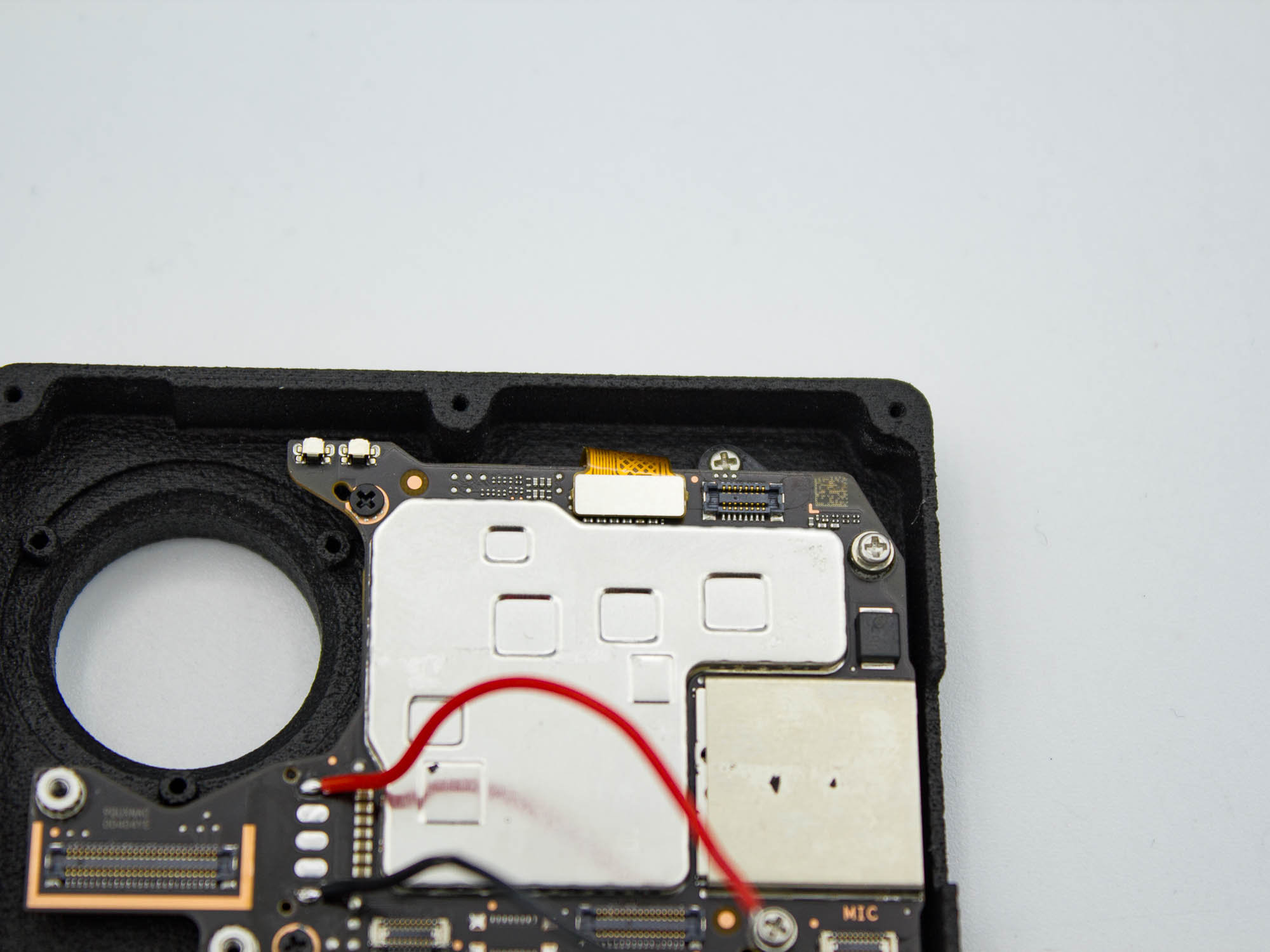 - Screw in the spare screw from the lens cover to the top right corner of the mainboard holder. Make sure to not screw it in to deep and damaging the front display.