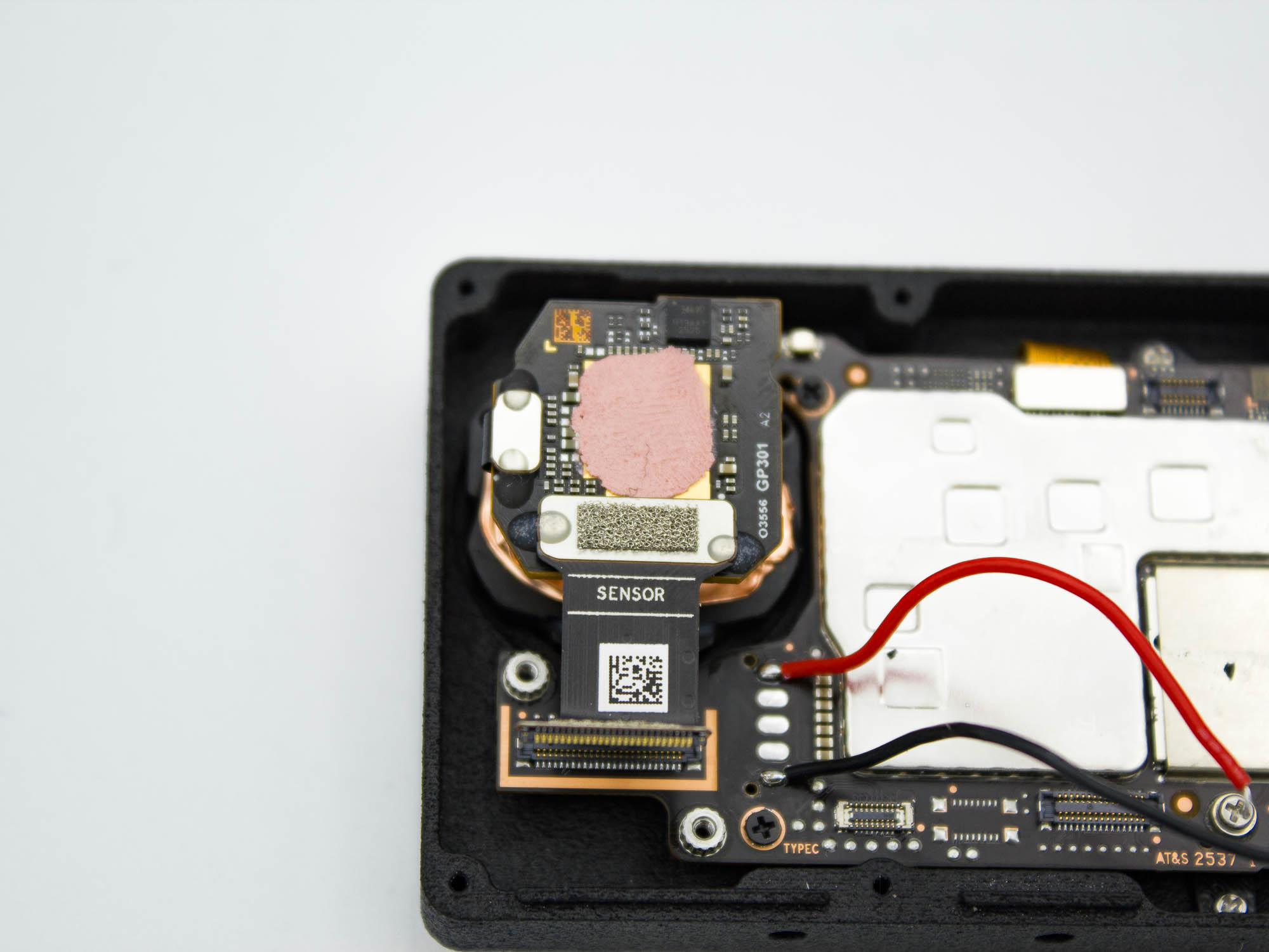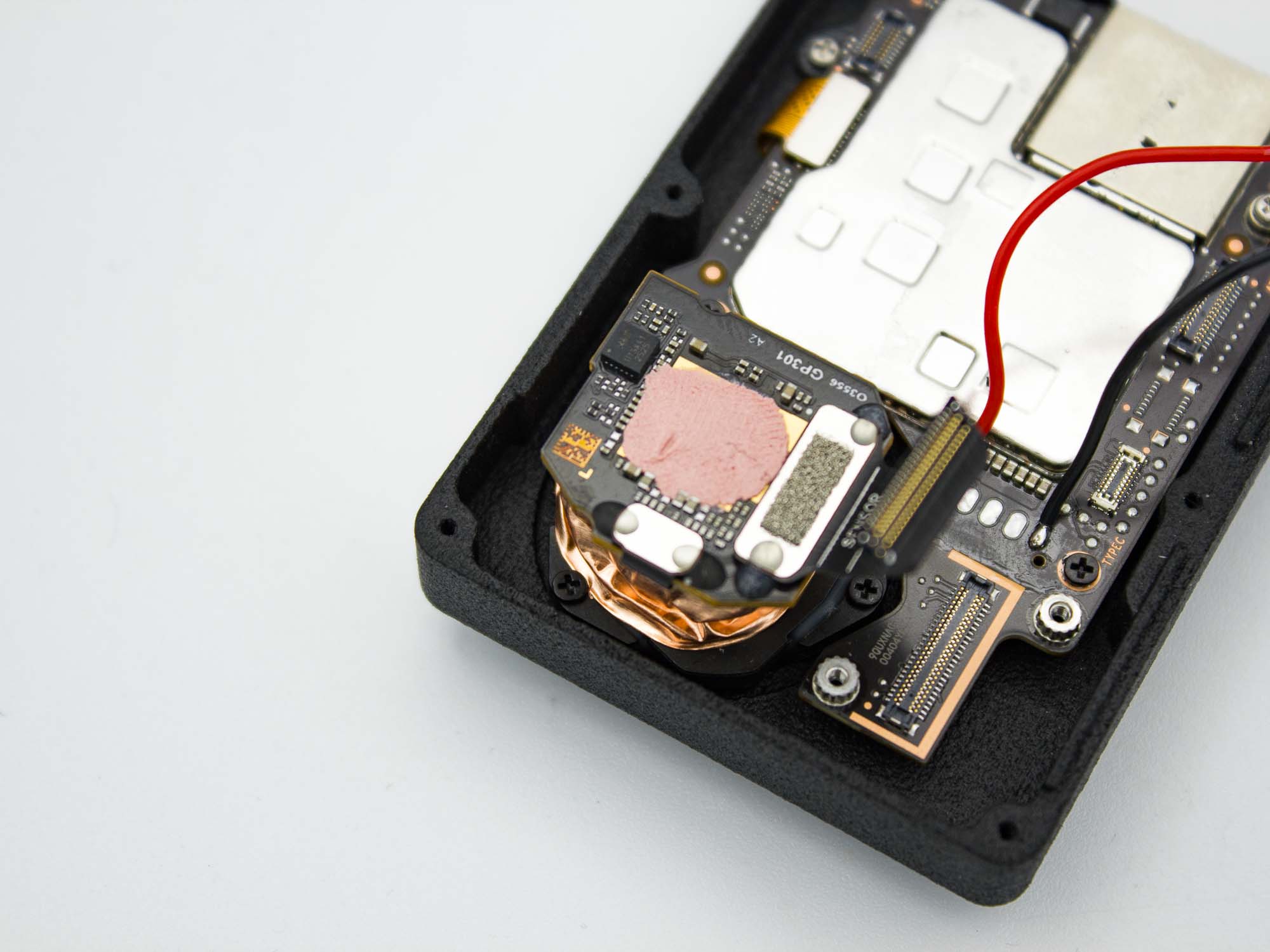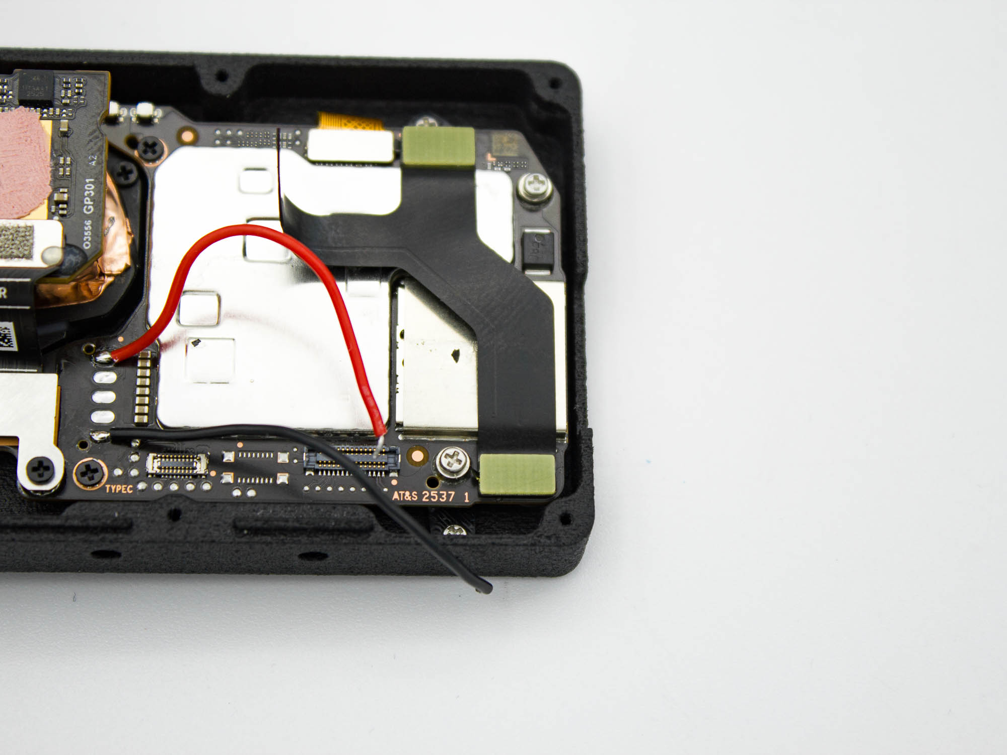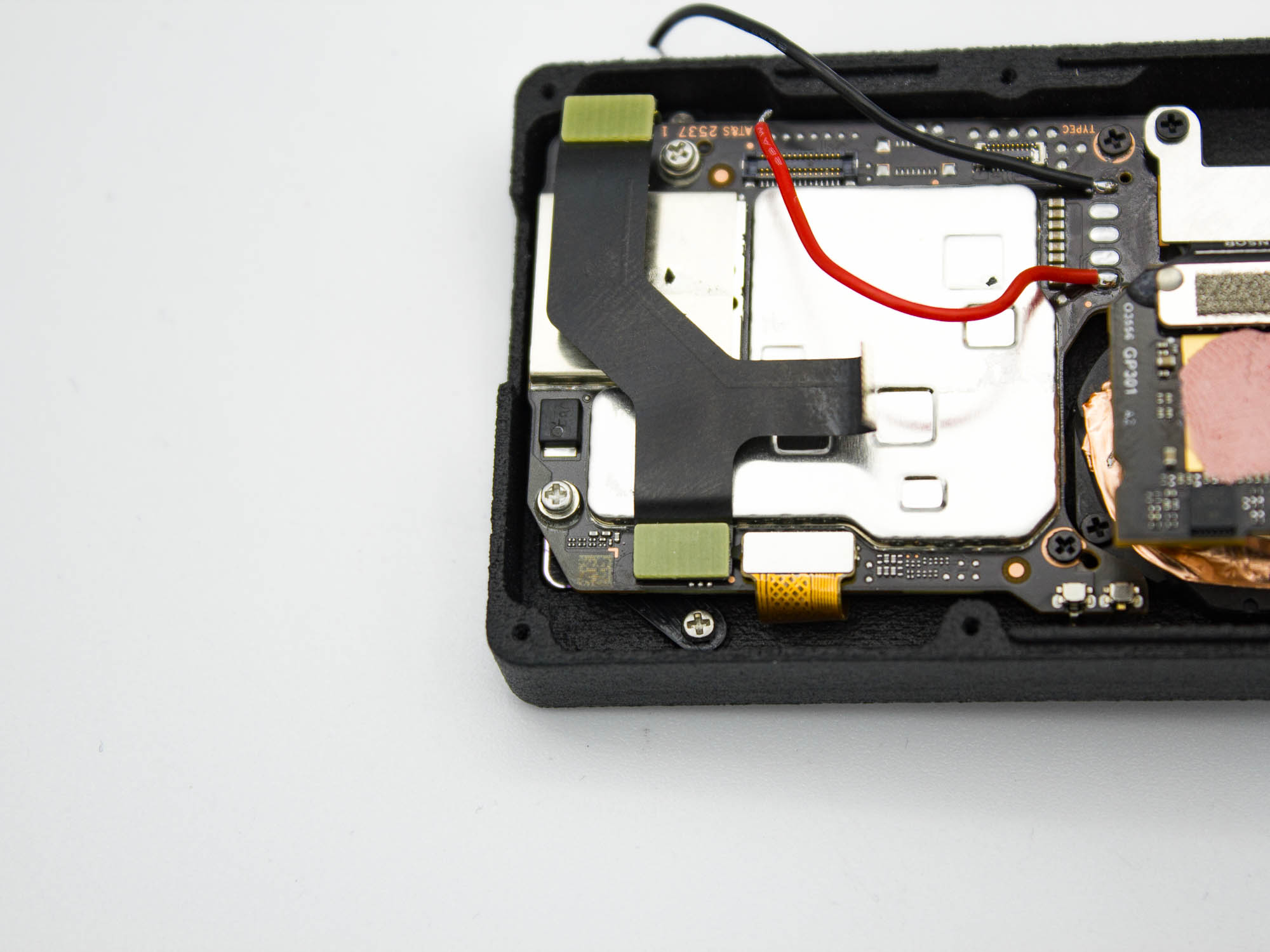 - Remove the two screws holding the USB C PCB in place using a PH0 screwdriver.